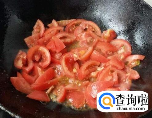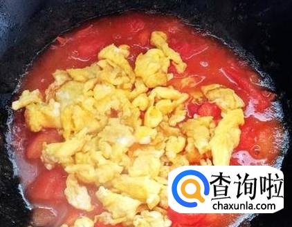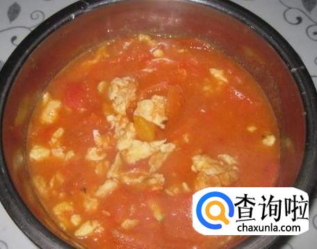 等西红柿熬出汤汁后,将鸡蛋块倒入锅中,让鸡蛋吸足了汤汁,就可以出锅了。