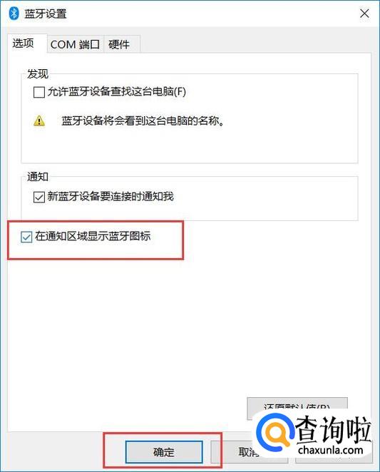 在接下来打开的蓝牙设置页面中,点击勾选在通知区域显示蓝牙图标复选框,点击页面底部“确定”按钮。