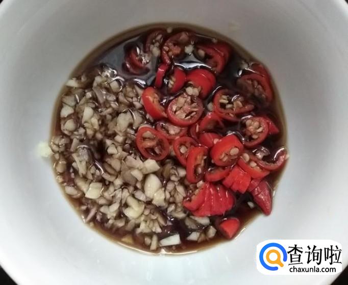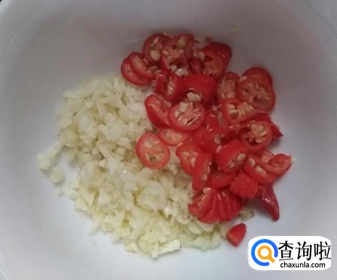 将切好的蒜末和小的鲜红辣椒放入碗中;