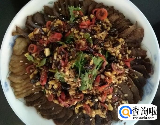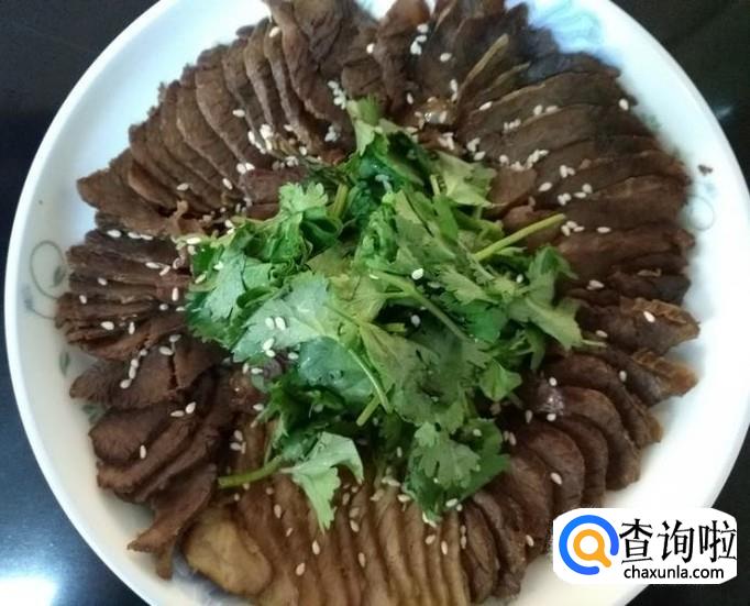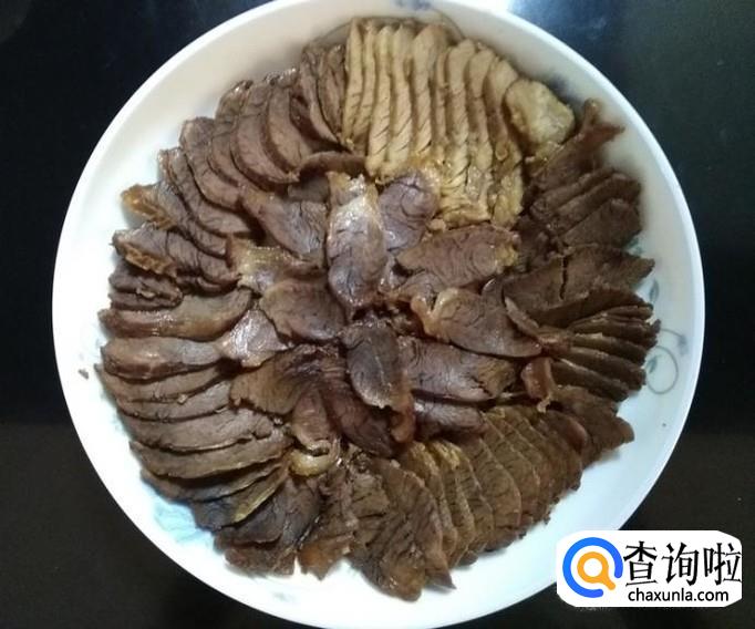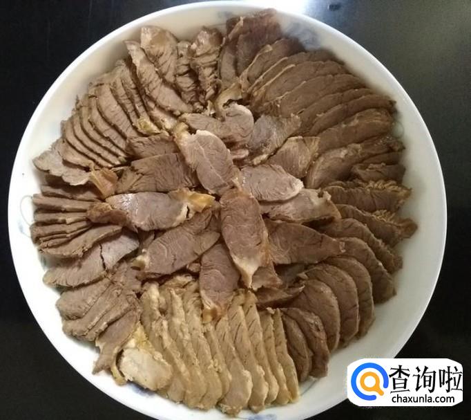 首先将已经做好的酱肉切片,尽量薄一些,摆盘摆成辐射状;