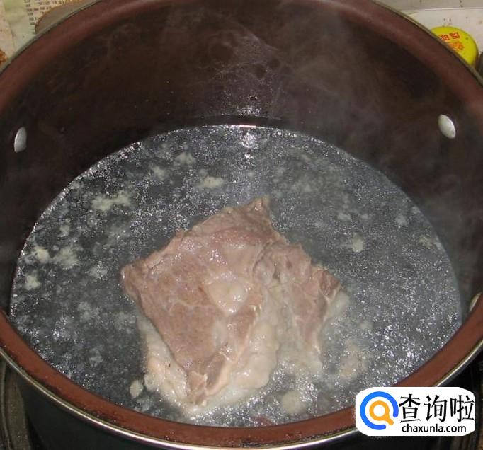 首先,我们将一块猪肉洗干净,然后放入锅中焯水,去掉浮沫。
