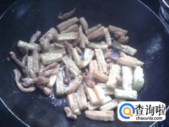 将焯过水的猪肉切成肉块,然后放入油锅中煎炸,待到两面炸至金黄色的时候便可以出锅,然后装入砂锅中。