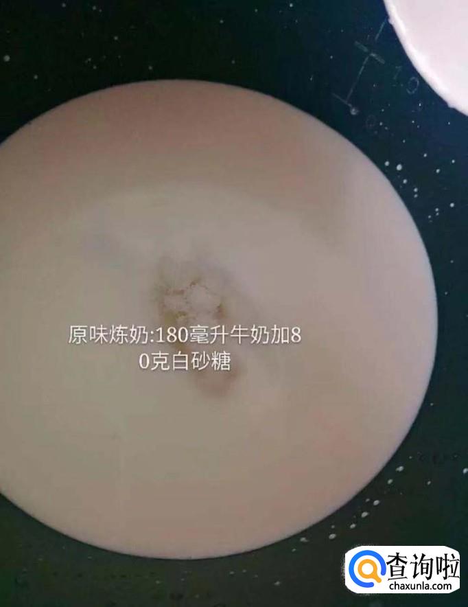 原味炼乳,首先在奶锅中加入180ml的牛奶和80克的白砂糖,如下图所示。