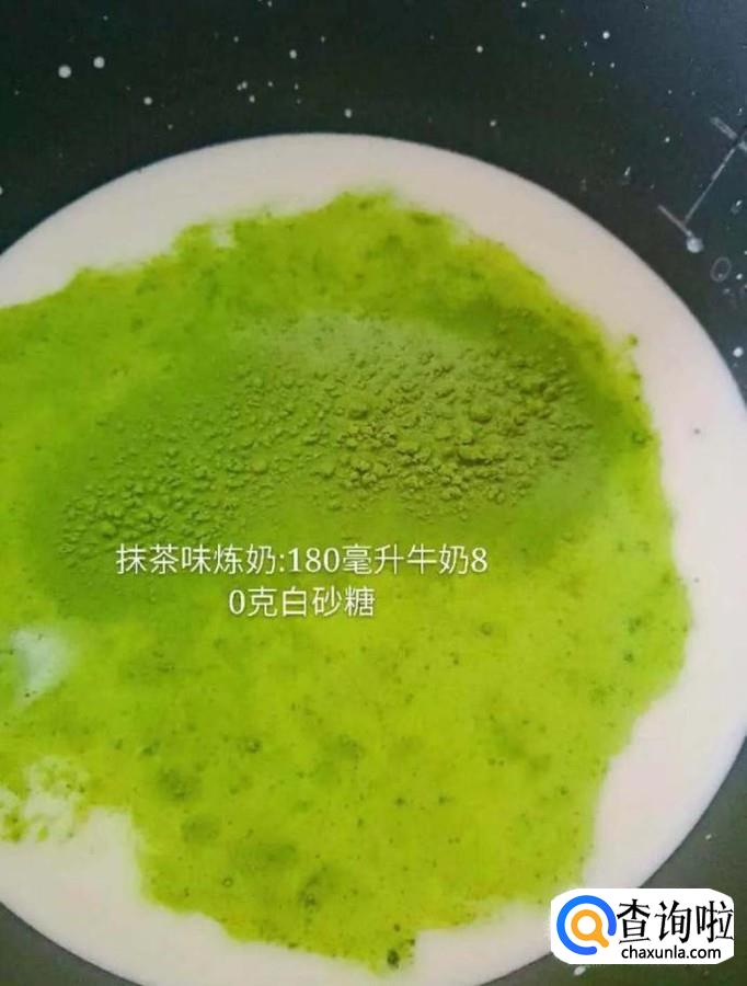 食材:180ml牛奶、80克白砂糖、抹茶(红曲)。
