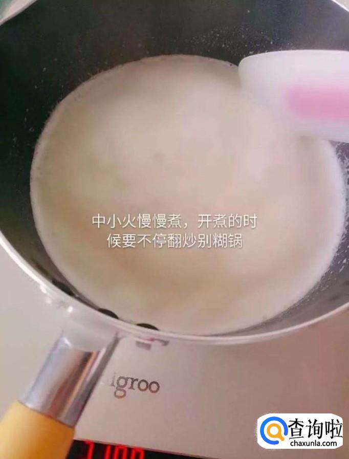 然后开中小火慢慢煮,如下图所示。小贴士:大家在煮牛奶的过程当中要不停的搅拌牛奶,这样的话才不会粘锅。