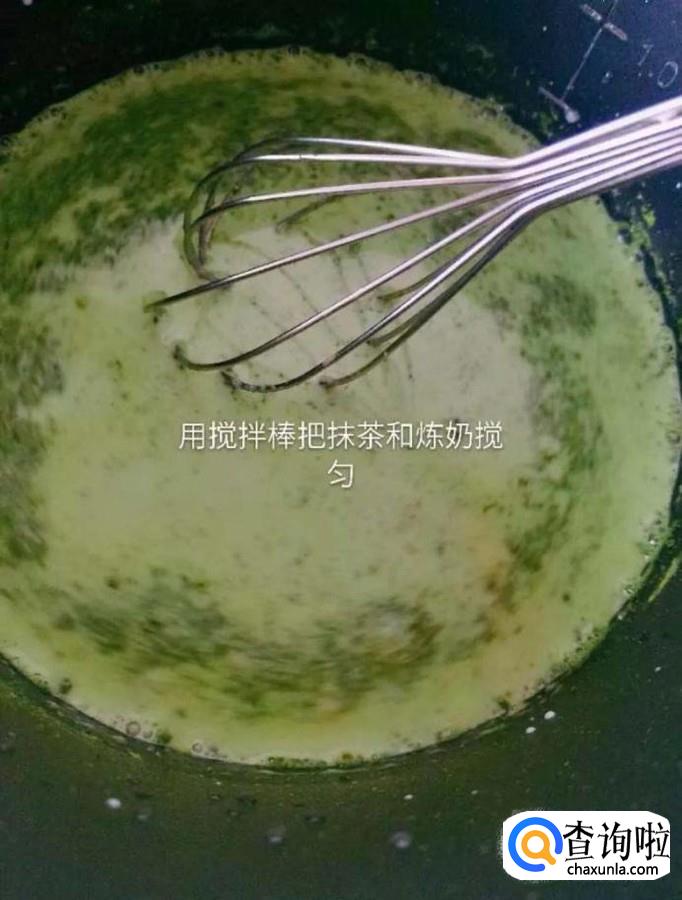 然后用打蛋器搅拌均匀,之后用中小火熬至,如下图所示。小贴士:抹茶味炼乳的熬至方法和原味炼乳的方法是一样的。