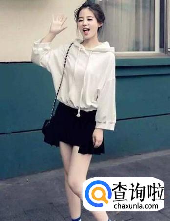 浅色的卫衣搭配深色的短裙,有一种少女感,很显年轻,又充满了活力,整个人都显得很活泼。