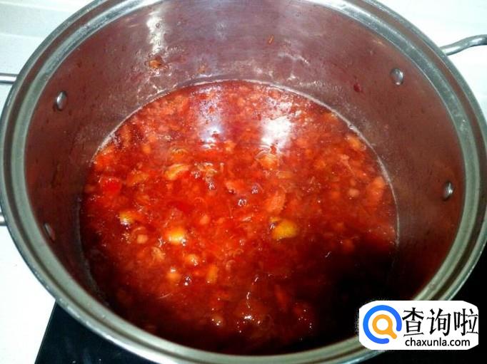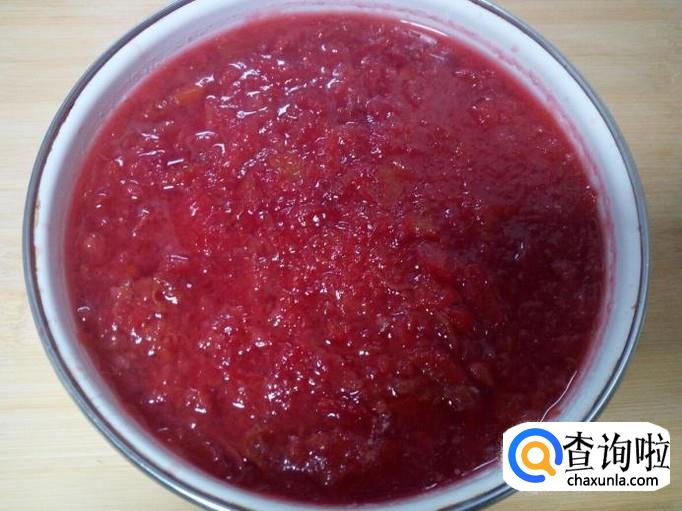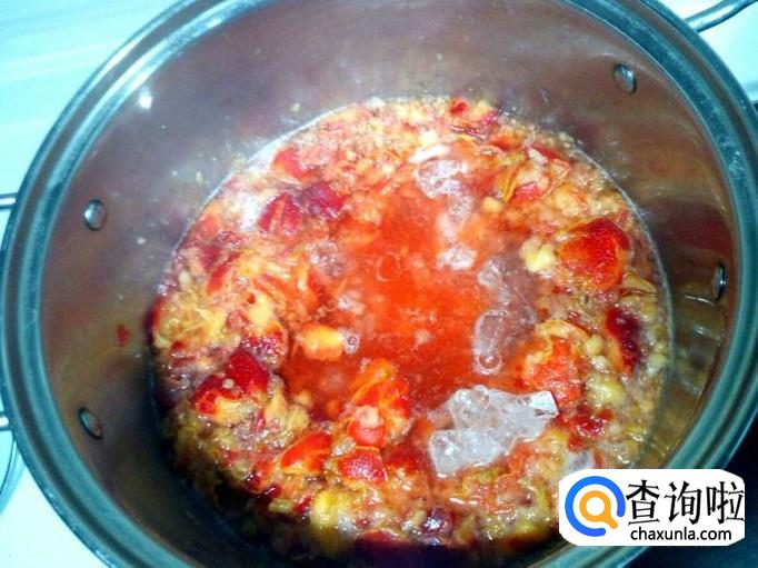 煮至山楂变软,用勺一边把山楂捣碎,一边搅拌。