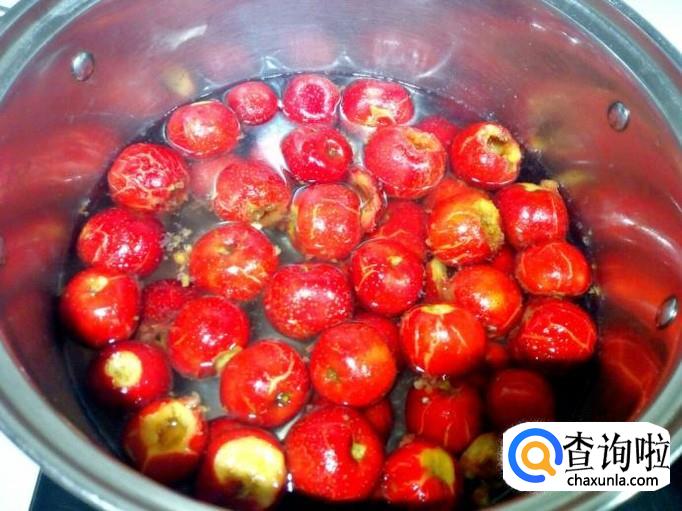 锅里放入水大火烧开,水开后放入山楂煮。水一定不要放太多,水放多了,煮出来的山楂酱,不粘稠。
