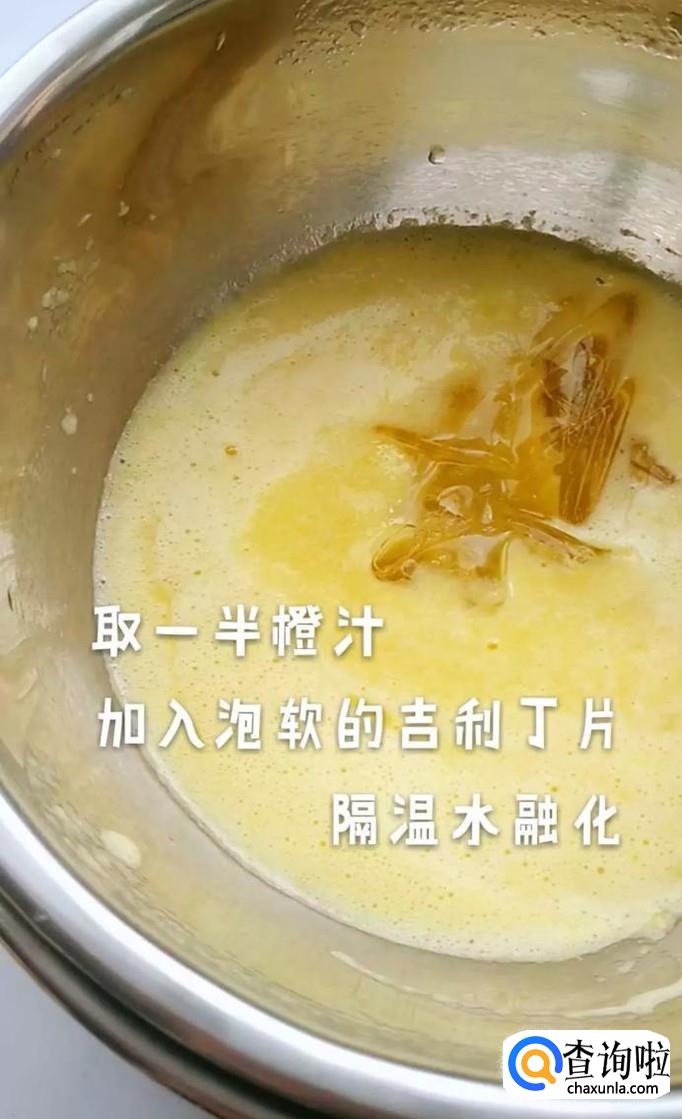 接着将吉利丁片用温水融化,加入一半的橙汁搅拌均匀,如下图所示。小贴士:想要做橙汁软糖,一定要用到吉利丁片,否则是很难成型的。