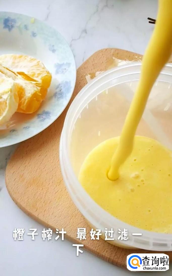 然后把橙子剥好用榨汁机榨出汁,如下图所示。小贴士:为了提高做出来的橙汁软糖口感,小编建议大家最好把橙汁过滤一下会比较好。