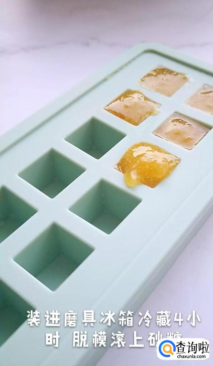 接着在模具上抹上一层油,把熬好的糖填充进去,之后放入冰箱冷藏四个小时就可以很方便的脱模了。
