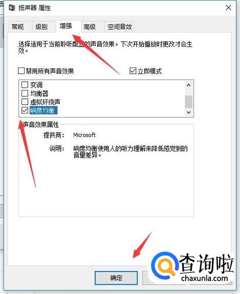 选择增强,然后勾选环境和响度均衡,然后确定。