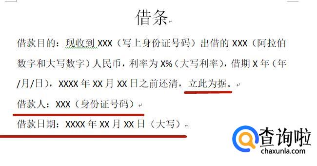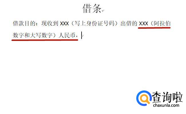 标题书写在纸的顶部,与正文之间不要留有空行,避免持有者在上方添加内容,正确写法为“借条”。