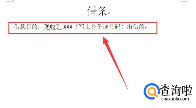 开头要写上借款的目的,防止出现没有必要的纠纷,现收到XXX(写上身份证号码)出借的