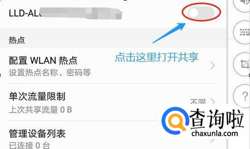 点击以后即可看到“移动网络共享”了,系统会自动给移动网络命名,我们只需将其打开即可,在配置WLAN热点处同样给其设置密码以及加密方式,以后的了解方法就是苹果手机一样了;