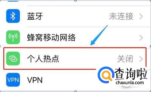 如何共享呢?那就要用到手机里自带的热点了,相信还有不少人到现在都不知道手机热点是什么意思!其实就是将手机转换成WiFi信号,然后其他设置搜索到这个信号就能利用这部手机的流量上网了,当然消耗的流量全部算这部共享手机的,下图就是苹果手机的“个人热点”位置,在手机设置界面即可找到;
