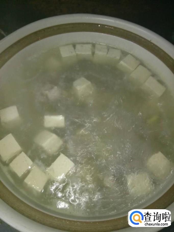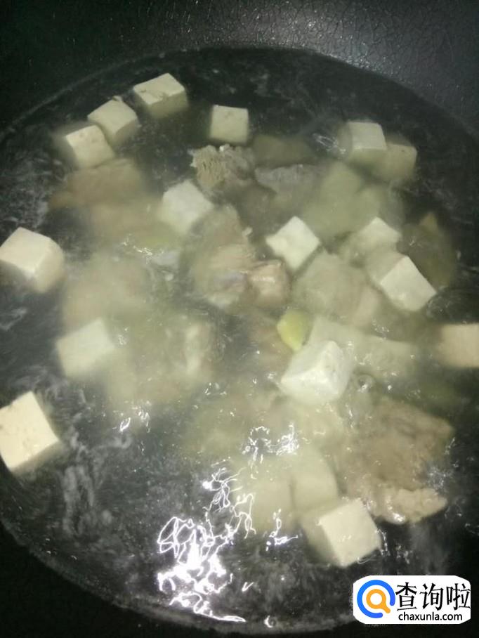 将排骨、姜片放入锅里,加入适量的水,再将豆腐下入锅里,煮开;