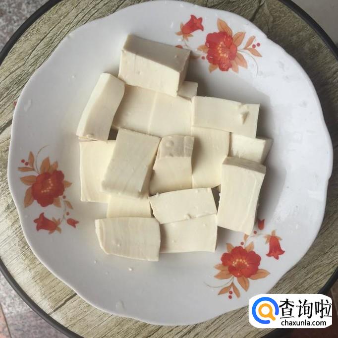 取一块豆腐,稍微过水,再将豆腐切成小块,备用;