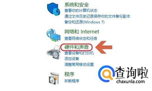 如果电脑右下角没有找到扬声器,那么打开控制面板,在其中找到“硬件和声音”选项,如图;