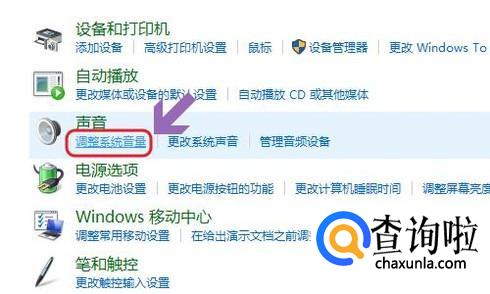 点击以后,在硬件和声音页面里继续点击声音下方的“调整系统音量”,这样也是可以的,见下图...