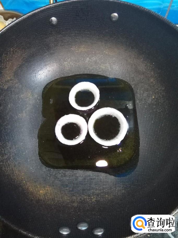 炒锅中放入适量油,油热后将洋葱圈放入锅中,小火慢煎。