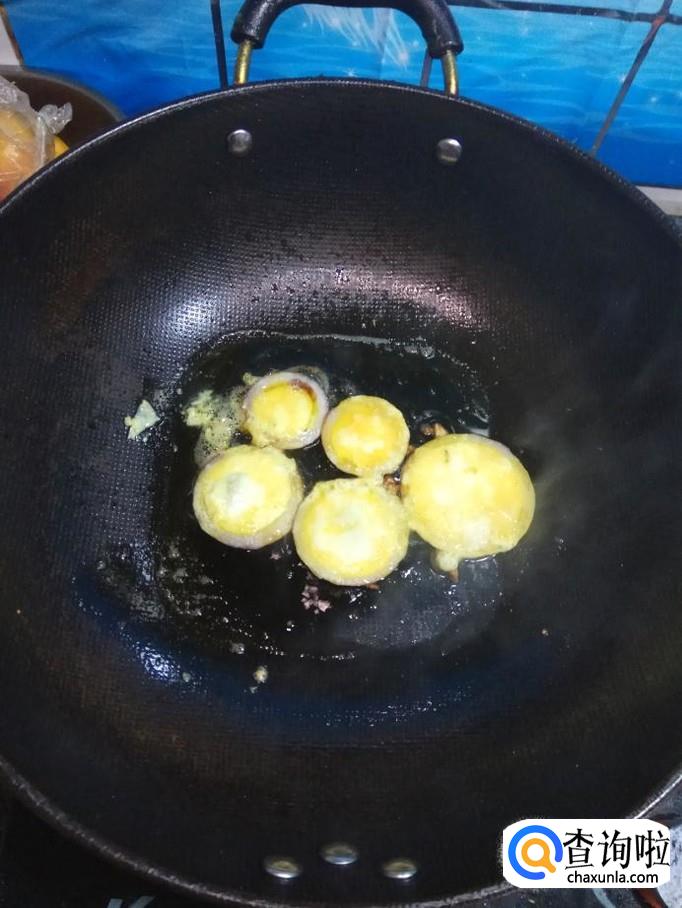 将鸡蛋液倒入洋葱圈中,慢慢的煎至鸡蛋定型,然后翻煎另一面,煎至两面金黄就差不多了。