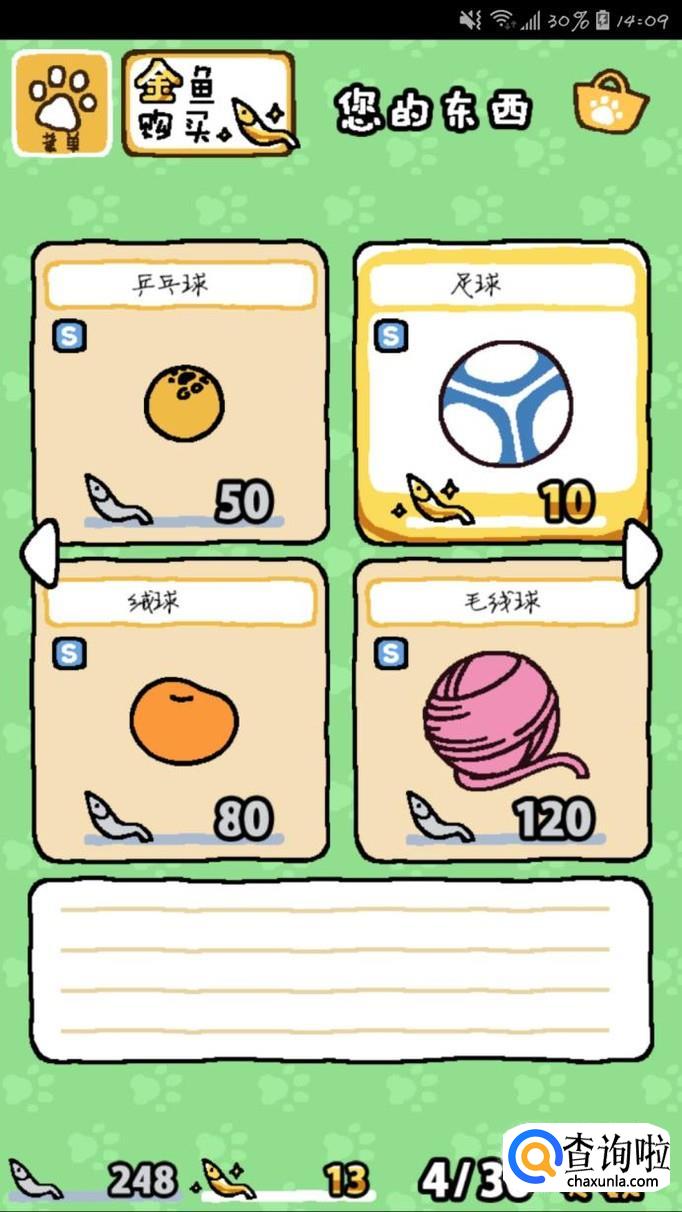 买玩具。玩具也是吸引猫猫的好东西哦!点击“菜单”-“购买道具”。