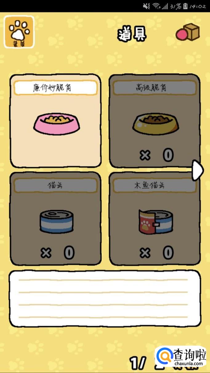 买粮食。用我们获得的小鱼干买干粮吧!可以吸引猫咪来屋子里哦!也是“菜单”-“购买道具”。