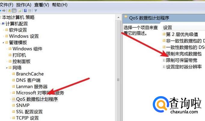 然后再展开到QoS数据包计划程序。在右边点击‘限制可保留带宽’。