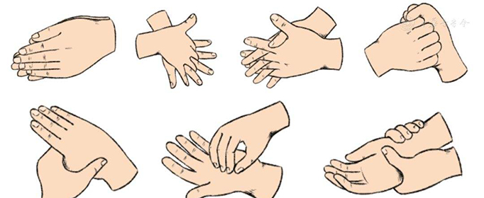 洗手掌,流水湿润双手,涂抹洗手液,掌心相对,手指并拢相互揉搓;洗背侧指缝,手心对手背沿指缝相互揉搓,双手交换进行;洗掌侧指缝,掌心相对,双手交叉沿指缝相互揉搓;洗指背,弯曲各手指关节,半握拳把指背放在另一手掌心旋转揉搓;洗拇指,一手握另一手大拇指旋转揉搓,双手交换进行。洗指尖 ,弯曲各手指关节,把指尖合拢在另一手掌心旋转揉搓,双手交换进行;洗手腕、手臂, 揉搓手腕、手臂,双手交换进行。
