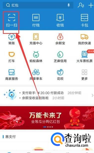 打开扫一扫功能之后,用该功能去扫描红包码即可得到支付宝余额宝红包,如图所示。