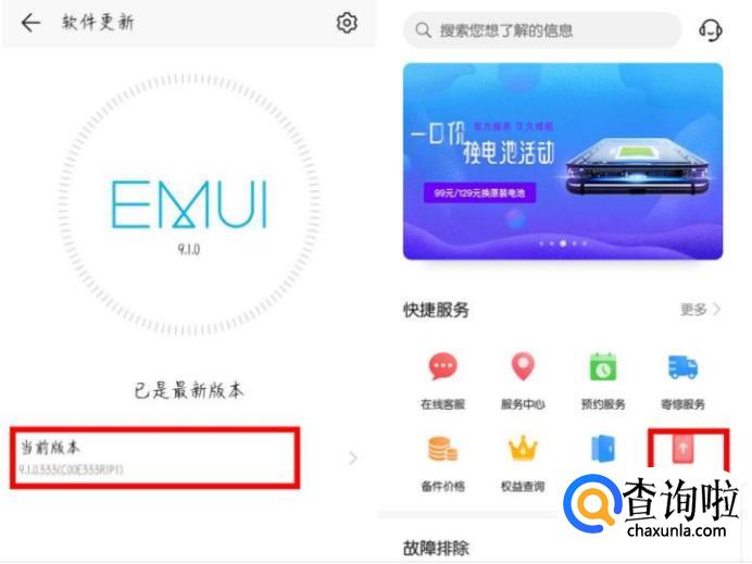 首先需要将EMUI9.1系统升级到333版本(下图所示),如果不是该版本的朋友,可以打开桌面上的服务APP→快捷服务→升级尝鲜→检查更新就能收到最新版本的更新包了。