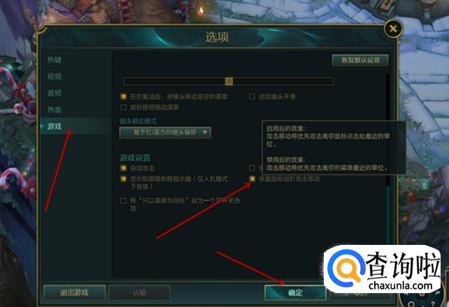 然后返回到选择主界面,选择游戏,找到依据鼠标指针攻击移动,然后将此项勾选,最后点击确定就可以了。