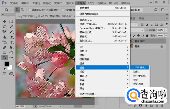 反选选区;接下来我们添加USM锐化滤镜效果,参数如图所示。