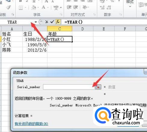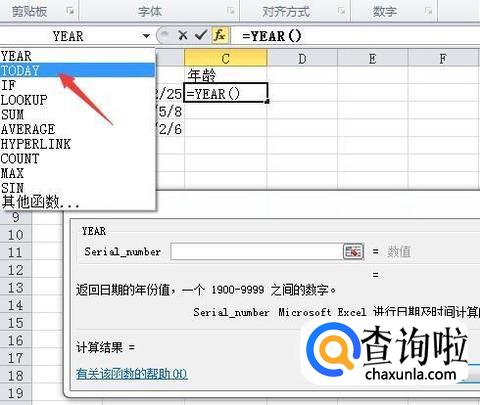 继续点击名称框,选择YEAR函数,在YEAR函数的括号中选择要计算的生日所在的单元格。