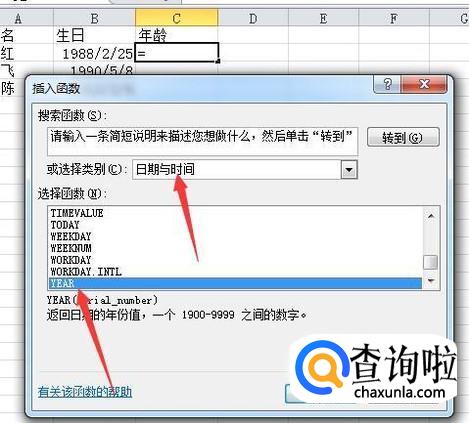 弹出插入函数对话框,类别处选择日期与时间,再选择year函数。