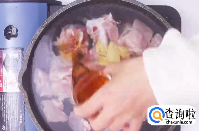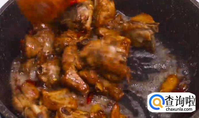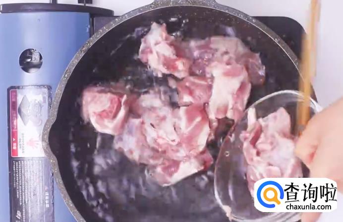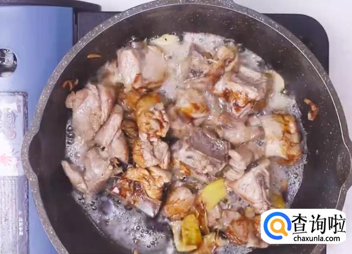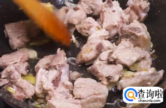 接着倒入排骨,炒至变色。