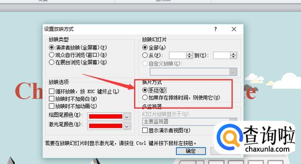 然后在打开的对话框的右边第二个选项“换片方式”下,点击“手动”,最后点击确定就可以了。