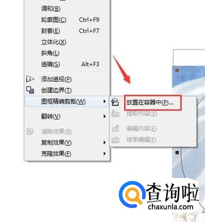 画好圆形之后选择图片我们在效果菜单里找到图框精确裁剪选项里的放置容器内选项,如图所示: