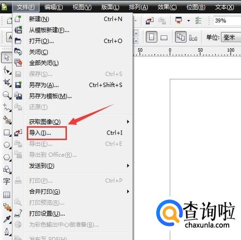 打开cdr之后我们在文件菜单里找到导入选项,如图所示: