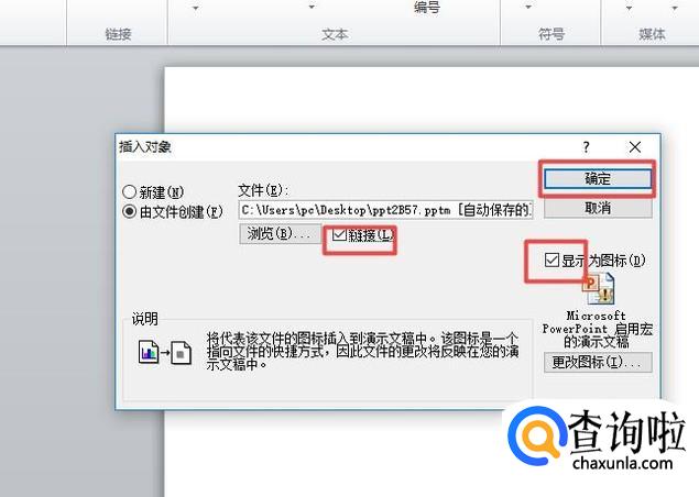 之后我们将链接勾选上,然后把显示为图标勾选上,之后点击确定;