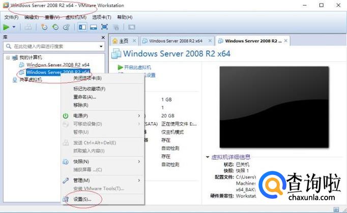如图所示,唤出"VMware Workstation 10"程序窗口。右击"我的计算机→Windows Server 2008 R2 x64",弹出快捷菜单选择"设置"项。