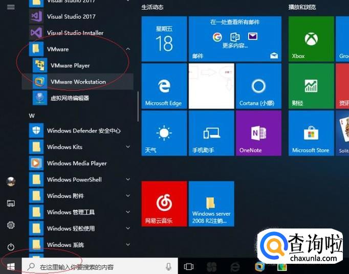 启动Windows 10操作系统,如图所示。点击任务栏"开始"按钮,弹出开始菜单选择"VMware Workstation"项。