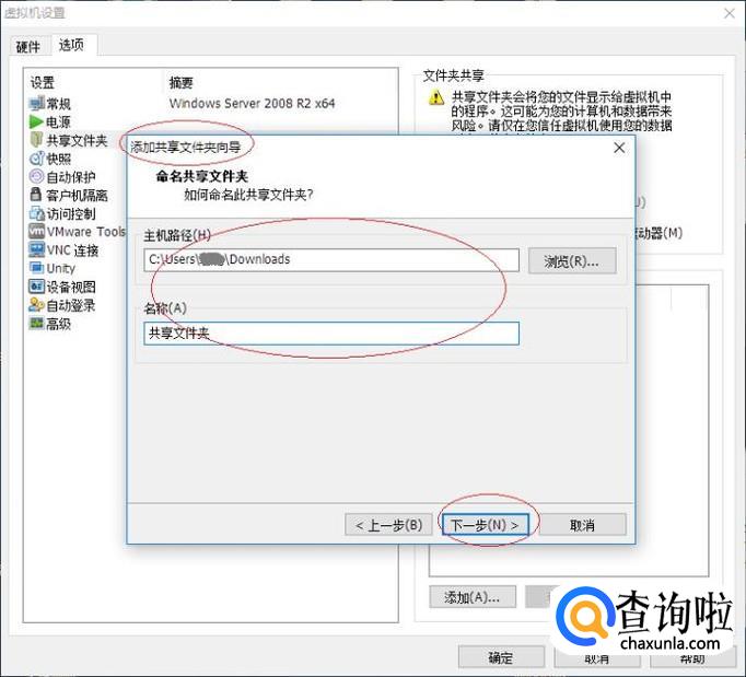 弹出"添加共享文件夹向导"对话框,如图所示。此向导用于向虚拟机添加共享文件夹,点击"下一步"按钮。
