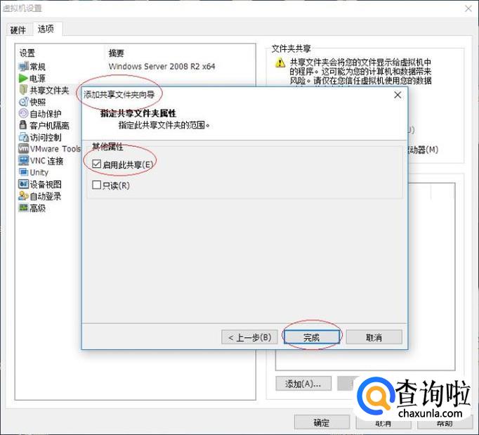 唤出"指定共享文件夹属性"界面,如图所示。勾选"其他属性→启用此共享"复选框,设置完成点击"完成"按钮。