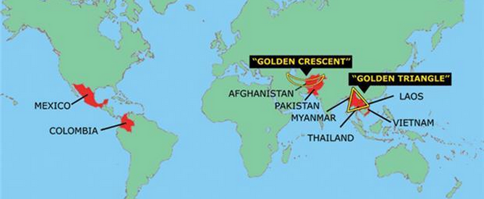 金新月国际毒源地是位于阿富汗、巴基斯坦和伊朗交界的三角地带。80年代以前,由于提炼技术的落后,鸦片一直是“金新月”地区毒品出口的终极产品,此后,随着西方毒品市场对海洛因需求量的猛增,鸦片的种植者和贩卖者认识到,直接出售海洛因更有利可图。