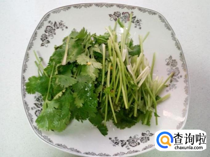 香菜收拾清洗干净,控干水分,切成10公分左右长的段。