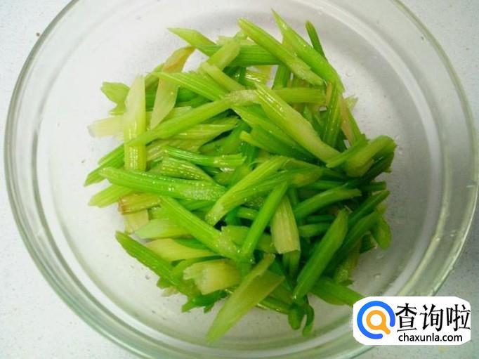 把芹菜用开水焯一下,入锅30秒钟捞出,迅速用冷水过凉,沥干水分。