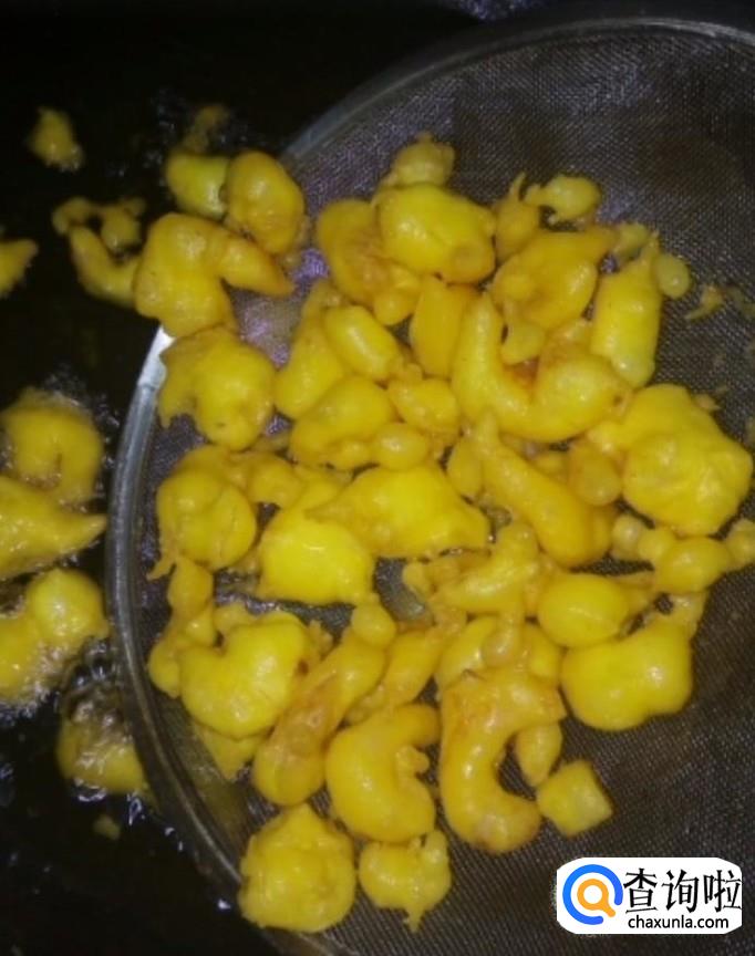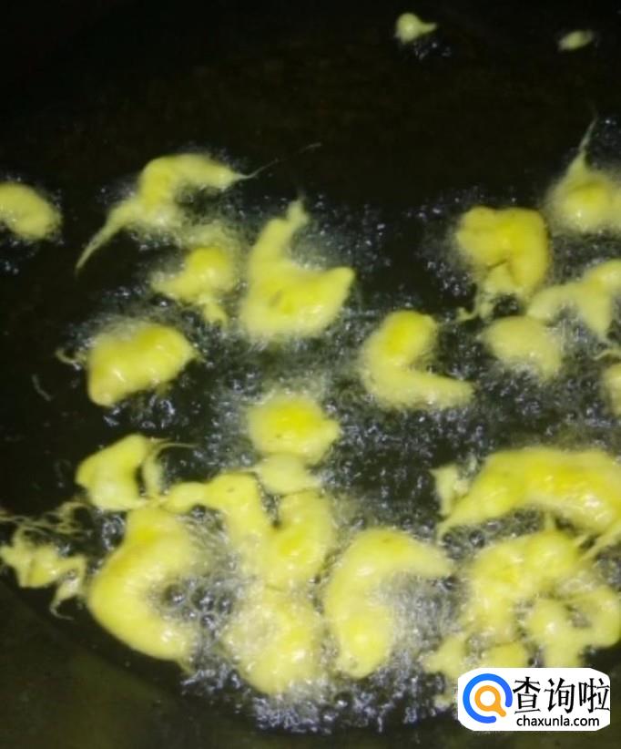 接着我们起锅烧油,油温五成热下入虾仁,开小火,炸至外表金黄捞出